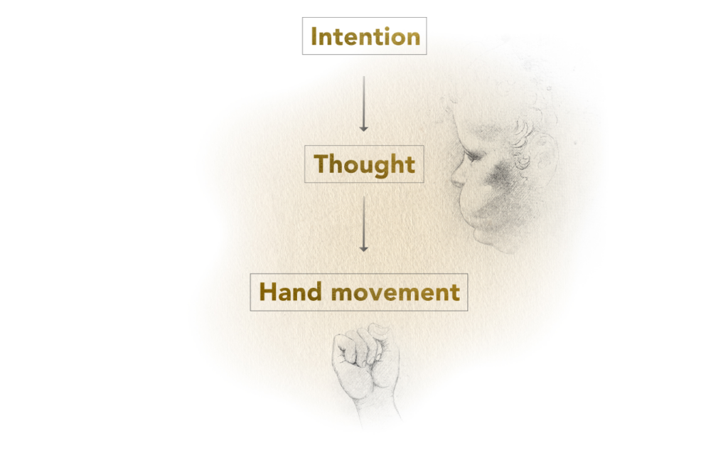Picture that wondrous moment when infants discover their hands, which happens at around two months. Prior to that the newborn is not even aware of his hands because they fall outside of his field of vision, which is focused almost exclusively on the mother and her breasts–which feel inseparable from him, for all is One. Then these fascinating dual appendages come into frame with all those articulating digits…